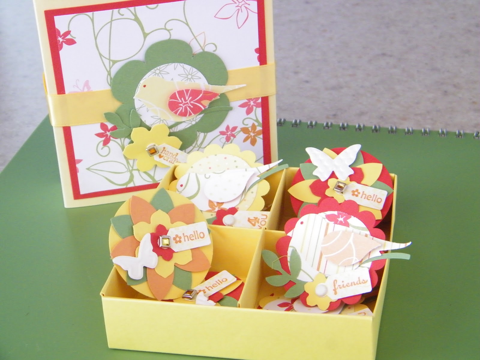 My friend Carol made this little box with tags for me! It is so stinkin' cute! You can see her blog at http://www.stuffbycarol.blogspot.com/ She used Garden Gala DSP and daffodi delight, Poppy Parade, Pear Pizzazz, and Peach Parfait CS. She used the cute little jewelry tag punch and coordinating tiny tags stamp set, square fire rhinestone and whipser white brads, the two-step bird punch, beautifl wings embosslit, birds and blooms flower pieces, 5 petal flower punch, scallop punch, daffodil delight satin ribbon, and probably some die for the large green 6 petal flower, but I don't know what it is....any ideas?